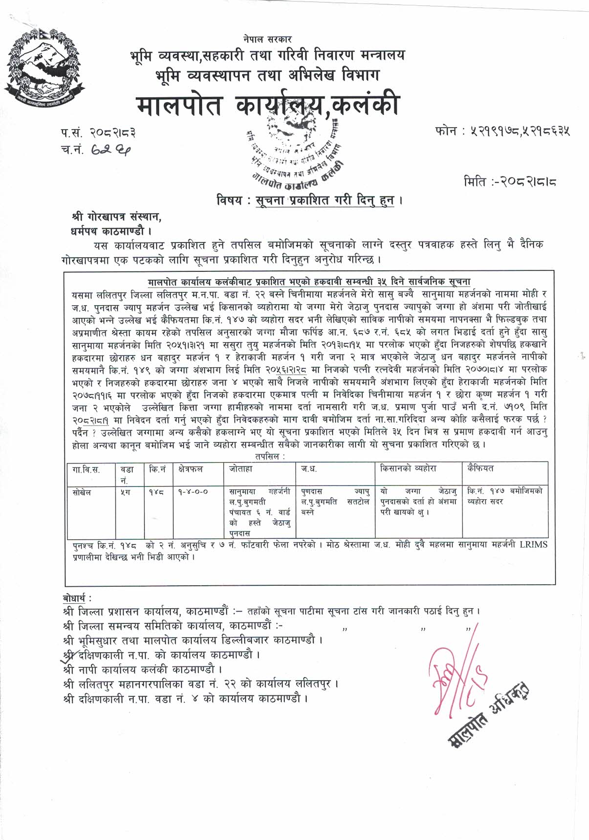 मालपोत कार्यालय कलंकीबाट प्रकाशित भएको हकदावी सम्बन्धी ३५ दिने सार्वजनिक सूचना !