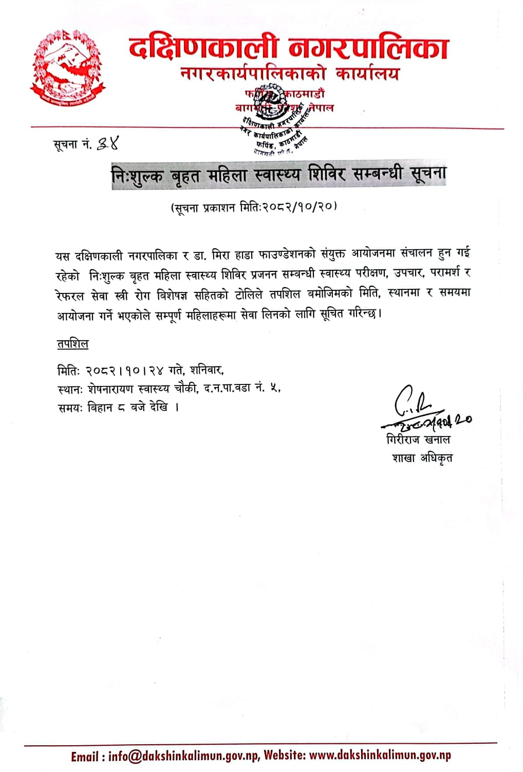 निःशुल्क बृहत महिला स्वास्थ्य शिविर सम्बन्धी सूचना !