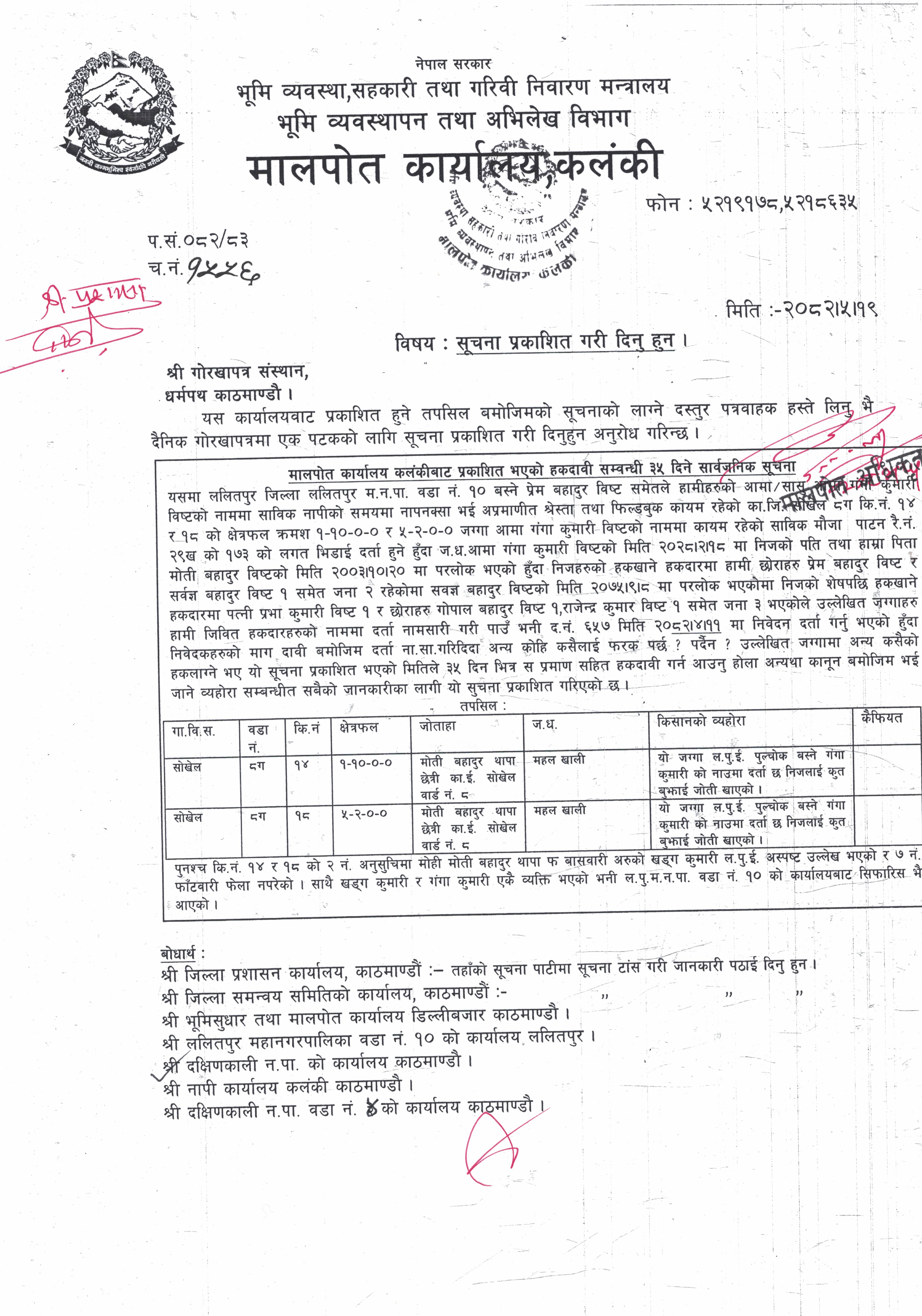 मालपोत कार्यालय कलंकीबाट प्रकाशित भएको हकदावी सम्बन्धी ३५ दिने सार्वजनिक सूचना !