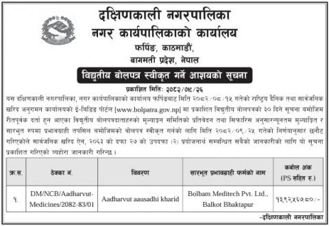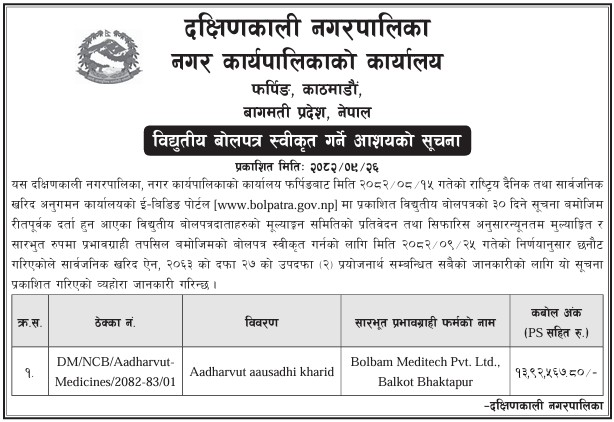 विद्युतीय बोलपत्र स्वीकृत गर्ने आशयको सूचना !